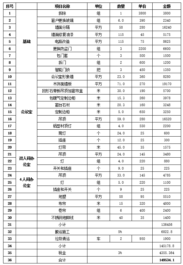 主要对100余平方米的两处办公场地进行环境改造,包括墙面地面拆除更新、墙面分隔(含隔音棉)、照明系统升级及防盗门更换等。