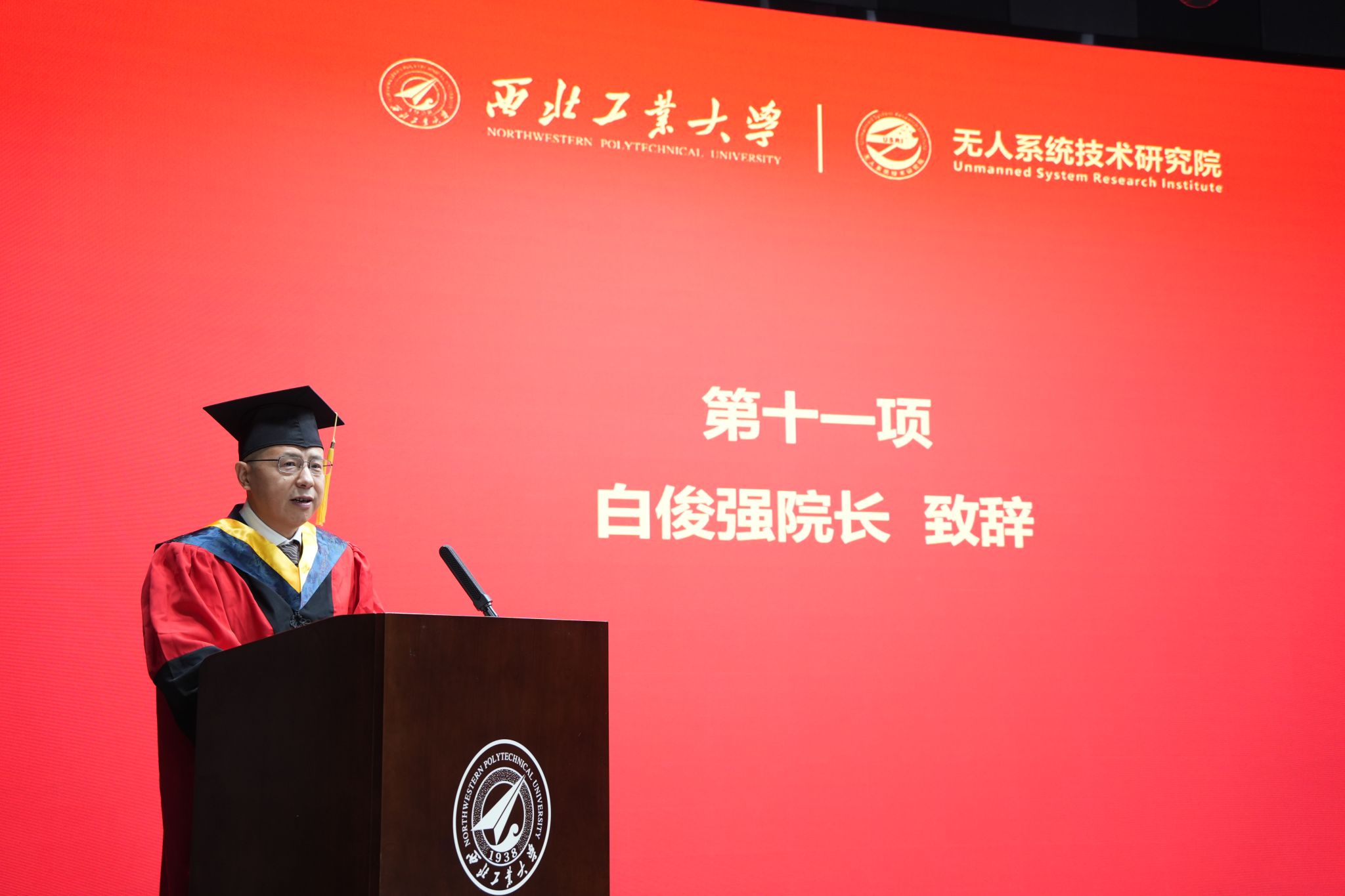 最后,白俊强发表讲话。作为毕业前的最后一课,他向顺利毕业的同学们表示热烈祝贺,向付出心血的全体教职工及家长们致以崇高敬意。他勉励毕业生们要牢记“公诚勇毅”的校训,传承研究院“敢为人先、追求卓越”的精神,在国家无人系统事业发展中勇挑重担,在实现科技自立自强的道路上绽放青春光彩。