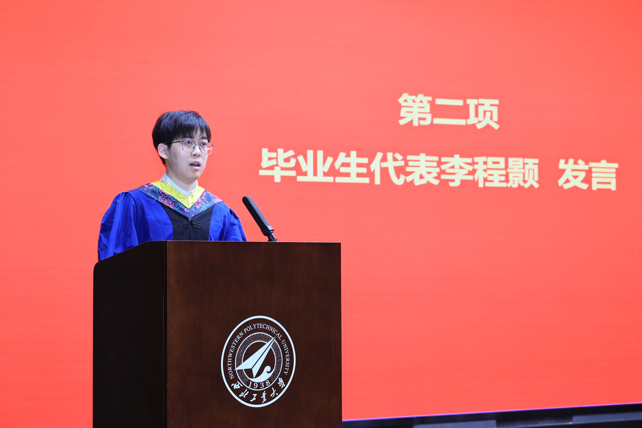 毕业生代表李程颢同学回顾了在研究院的求学时光,分享了科研路上的成长与感悟,向悉心指导的导师、默默奉献的教工及并肩前行的同窗表达了诚挚谢意,并代表全体毕业生许下扎根行业、勇攀高峰、矢志报国的青春誓言。