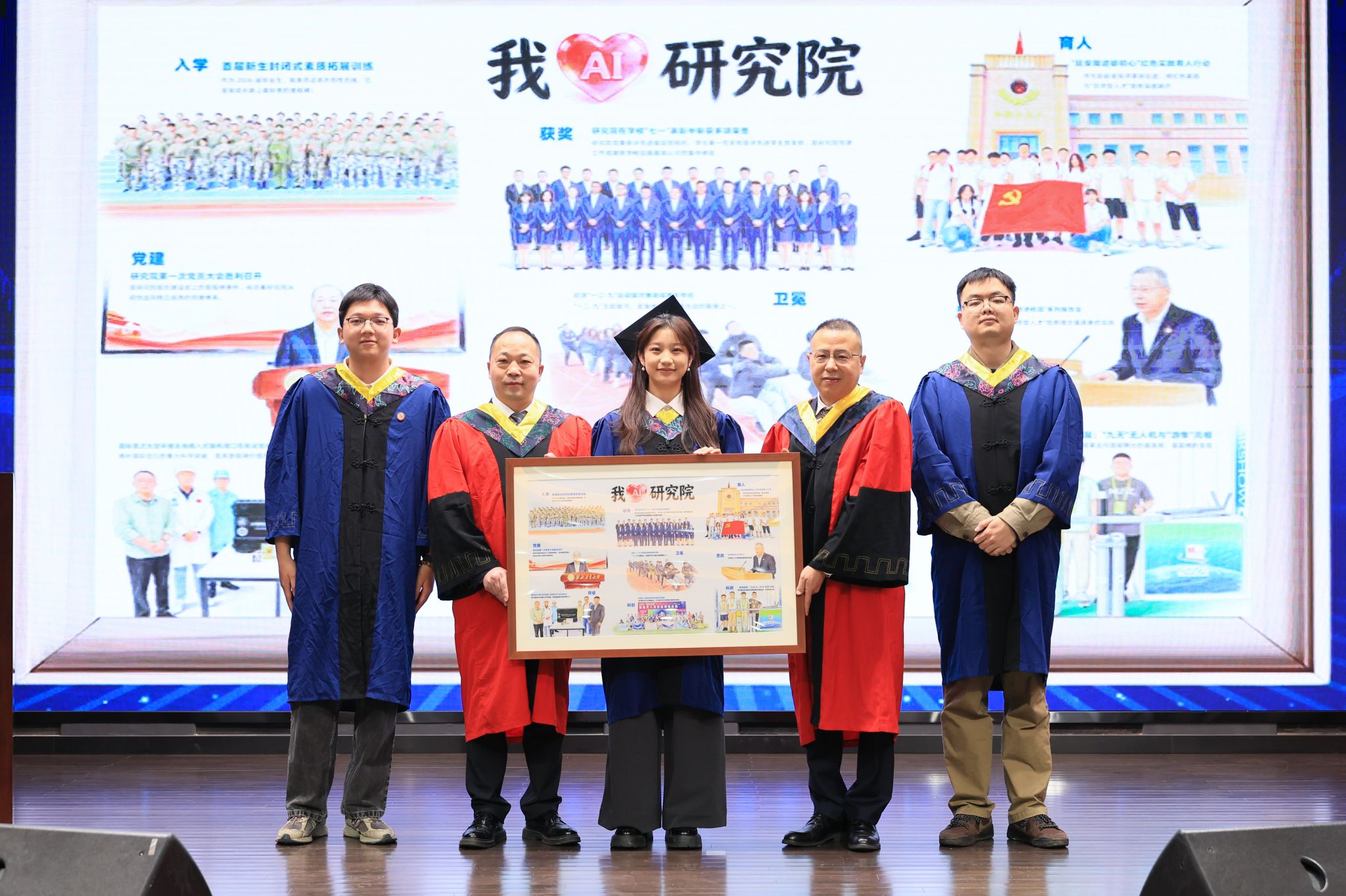白俊强和毛昭勇代表研究院接受毕业生代表向研究院回赠的纪念礼物,该礼物不是一幅普通的画,而是学子们用AI技术为研究院制作的“时光胶囊”,以一份赤诚心意定格青春芳华、镌刻求学印记,续写与学院的深厚情谊,让这份院情联结代代相传。