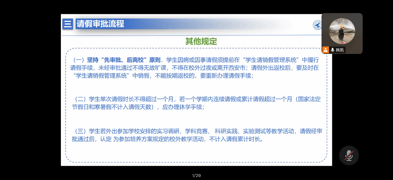 随后,会议重点宣讲和解读了学校的学生请销假管理规定。韩凯特别强调了“先审批、后离校”的基本原则,要求学生所有请假必须事先通过“学生请假管理系统”提交并获批,提醒同学们严格遵守学校规定,合理安排离校与返校时间。