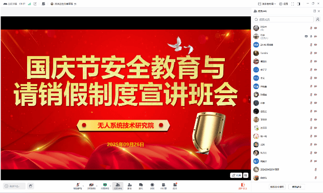 双节同庆,安全同行。为确保国庆节、中秋节假期期间学生安全,强化纪律意识,帮助同学们度过一个平安、祥和的假期,2025年9月26日,无人系统技术研究院组织召开了国庆节、中秋节安全教育与请销假制度宣讲班会。本次班会由辅导员韩凯主持,研究院党委副书记徐晓峰、研究院全体学生参加。