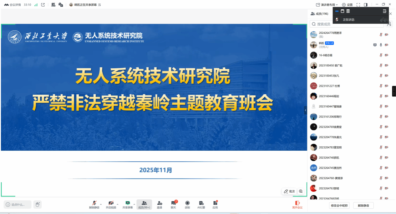 11月9日,为进一步增强学生安全意识和法纪观念,坚决杜绝非法穿越秦岭等违规行为,无人系统技术研究院组织开展“严禁非法穿越秦岭”主题教育班会。本次班会由辅导员韩凯主持,研究院党委副书记徐晓峰做主题教育,研究院全体学生参加。