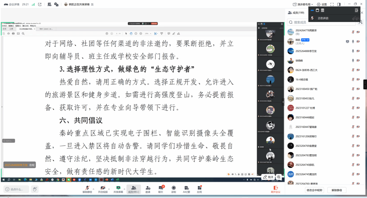 最后,会议倡议同学们珍惜生命、敬畏自然,遵守法纪,坚决抵制非法穿越行为。此次班会增强了同学们的安全意识和法律观念,同学们表示将自觉遵守规定,共同守护秦岭生态安全。