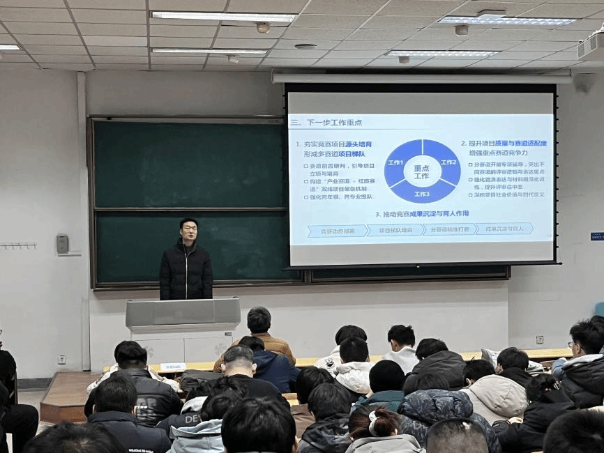 会议第二项,全体与会人员集中观看学习了中国国际大学生创新大赛优秀项目路演视频。通过观摩高水平赛事的精彩展示,同学们直观感受到优秀项目在创新构思、路演表达和团队协作等方面的突出特点,进一步拓宽了视野,为今后参与各类学科竞赛积累了宝贵经验和启示。